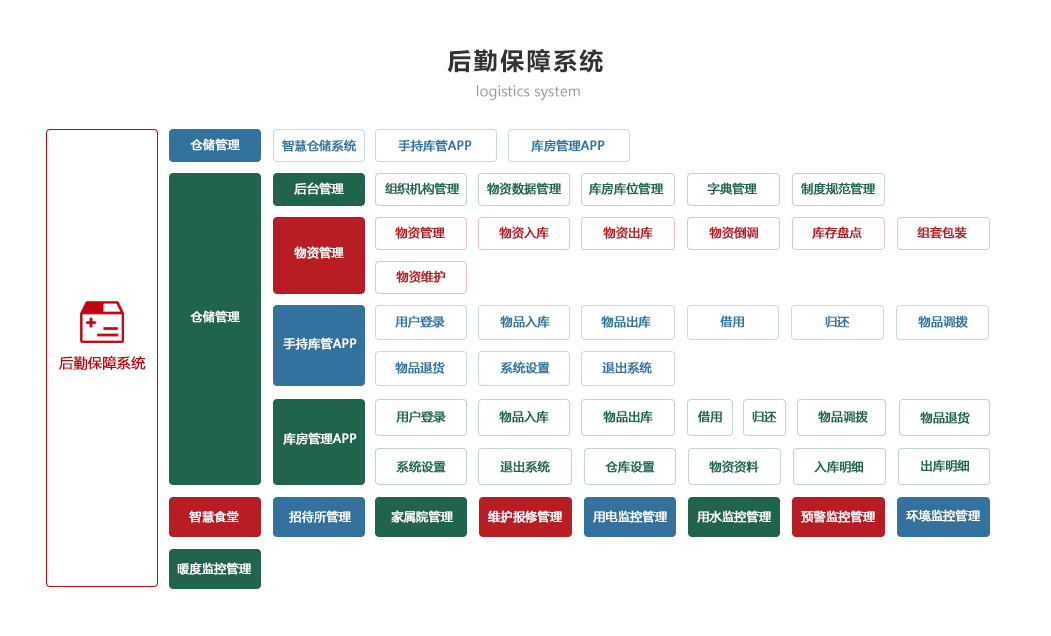 綜合保障系統(tǒng)依托物聯(lián)網(wǎng)、RFID識別和傳感技術,著眼作戰(zhàn)精準保障、戰(zhàn)備常態(tài)保障和官兵生活保障,對戰(zhàn)備物資、裝備器材、營房物資和被裝物資等的全生命周期的電子化管理,對官兵的健康實時監(jiān)護。包含財務管理、軍需油運、武器裝備、衛(wèi)勤管理、營房管理模塊。確保部隊出動,車輛給養(yǎng)油料跟得上,裝備維護情況實時掌握,營房管理工作平時與戰(zhàn)備同步推進。